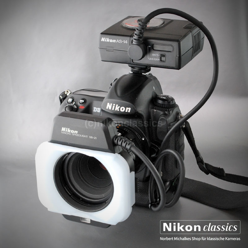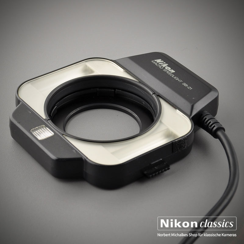 Der SB-21 ist ein Spezialblitz für die Blitzfotografie im Nahbereich. Er besitzt allerdings keine ringförmige Blitzröhre, sondern zwei separate Röhren links und rechts im Reflektor, die entweder einzeln oder gleichzeitig gezündet werden können.