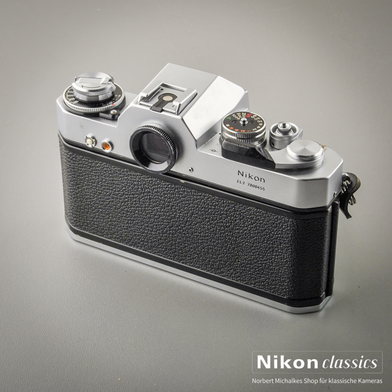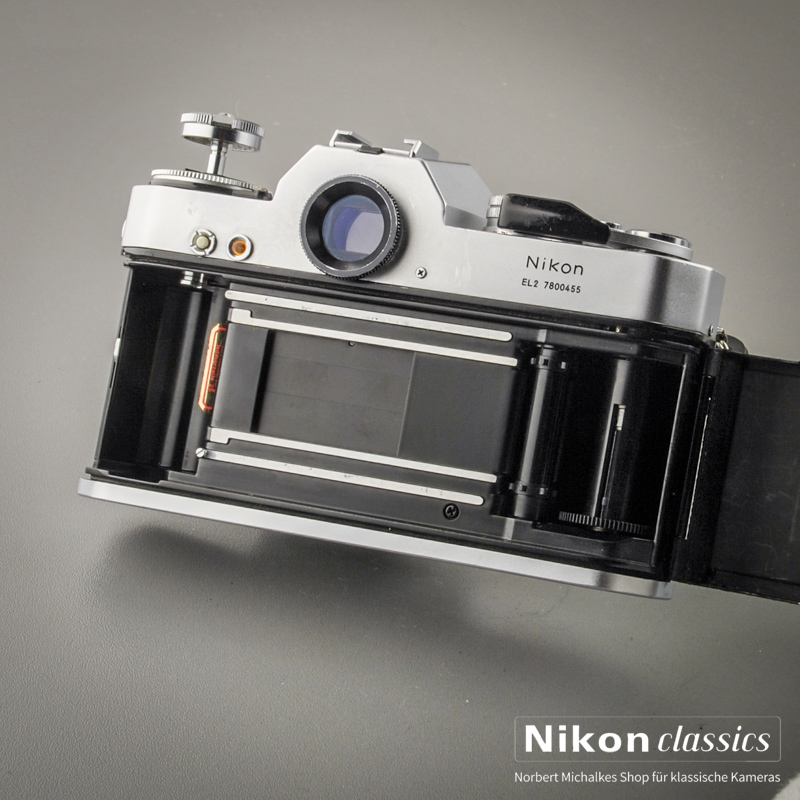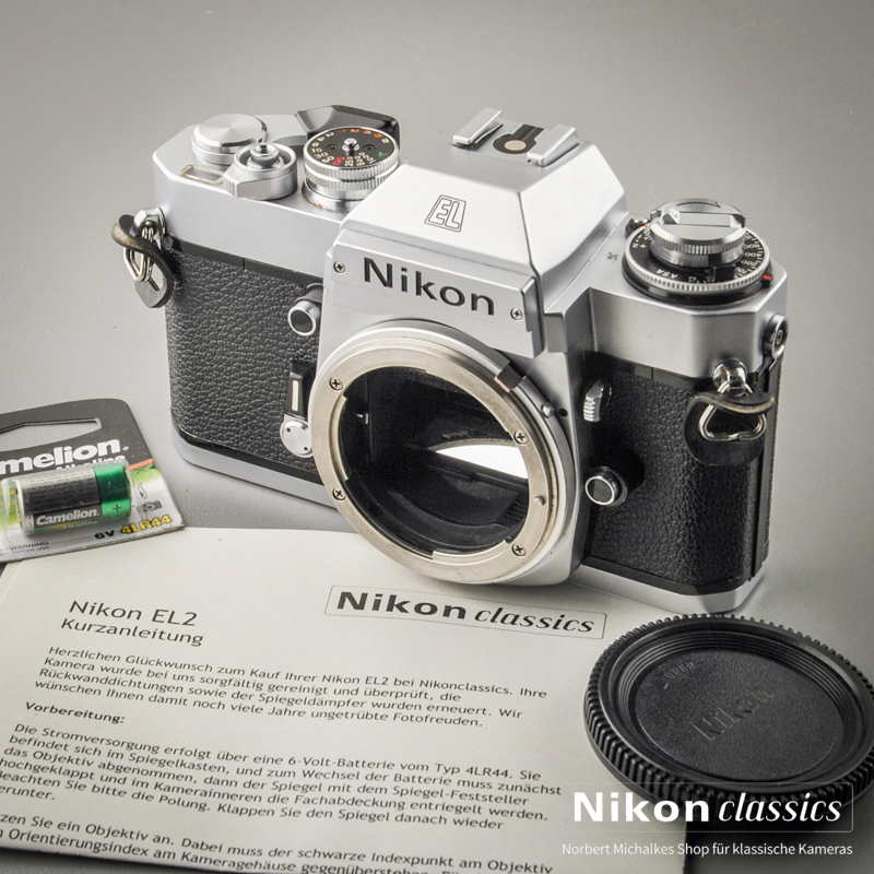 Baujahr 1977. Die Nikon EL2 erlitt das gleiche Schicksal wie die Nikkormat FT3: noch im Jahr der Einführung wurde die Produktion zugunsten des kompakteren Nachfolgers Nikon FE eingestellt. Die EL2 ist deshalb heute recht selten.