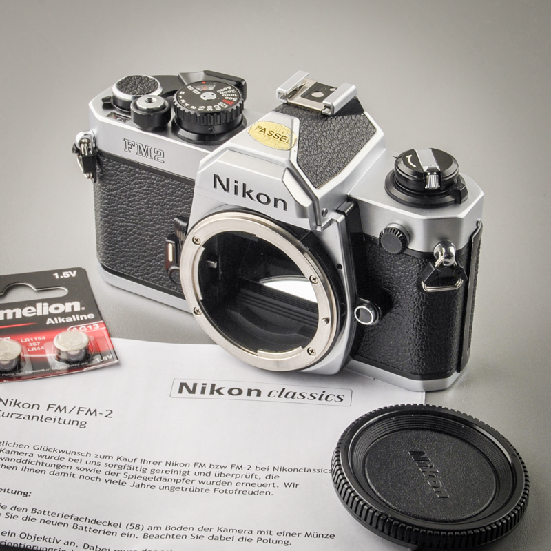 Der legendäre und unverwüstliche Klassiker, funktioniert notfalls auch ohne Batterien. 1984 wurde die FM2 überarbeitet, die neue Version hat die Blitzsynchronzeit 1/250 s und wurde mit einer helleren und jetzt auch wechselbaren Einstellscheibe vom Typ K2 ausgerüstet. Auch die neue Version trägt die Bezeichnung FM2, jedoch wurde die Seriennummer der überarbeiteten Version durch ein führendes "N" ergänzt. Sie kann von der ursprünglichen Variante außerdem durch die in der normalen Zeitenreihe rot markierte Blitzsynchronzeit "250" statt "125" unterschieden werden. Die vorher separat markierte und einstellbare Synchronzeit "X200" fehlt beim neueren Modell.