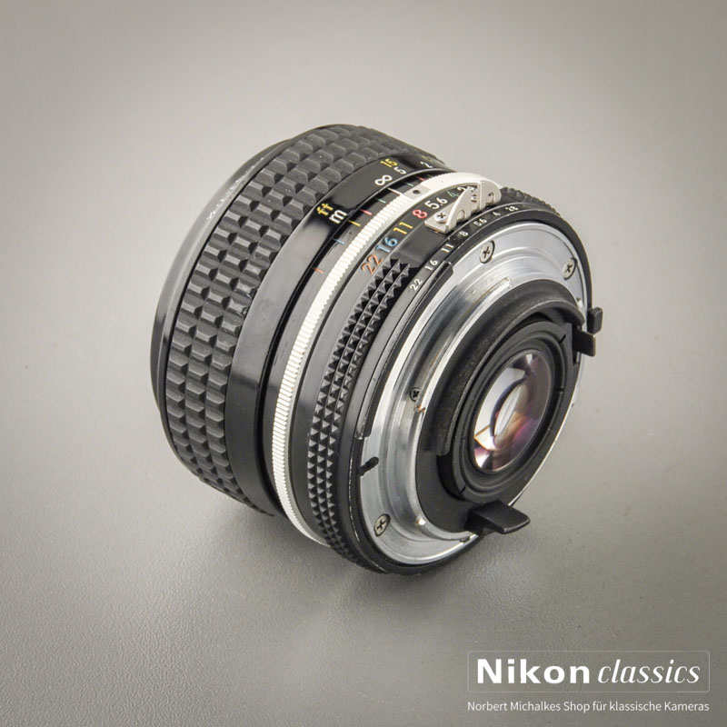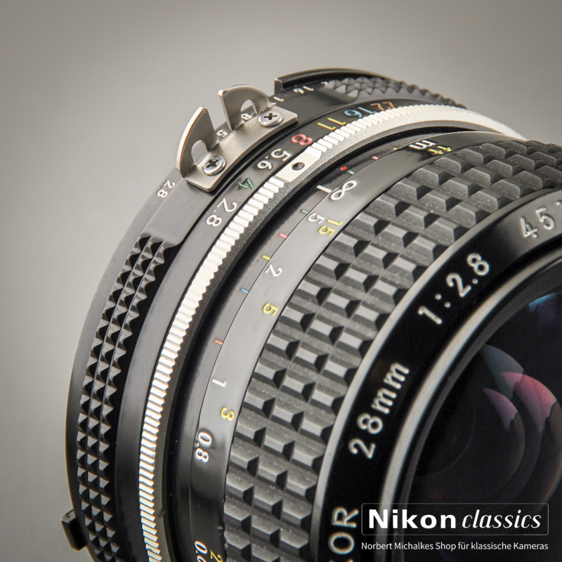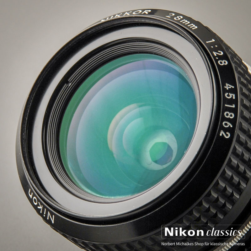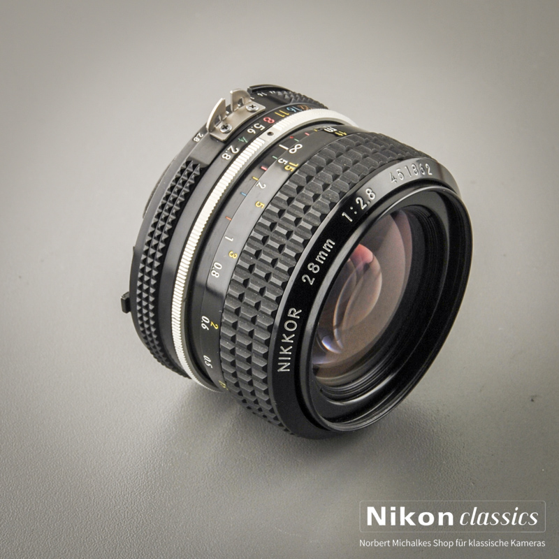 Das klassische Weitwinkelobjektiv 28mm/1:2,8. Es handelt sich nicht um das einfachere und billigere Serie-E-Objektiv, sondern um das Original Nikkor in der Vollmetall-Ausführung!
