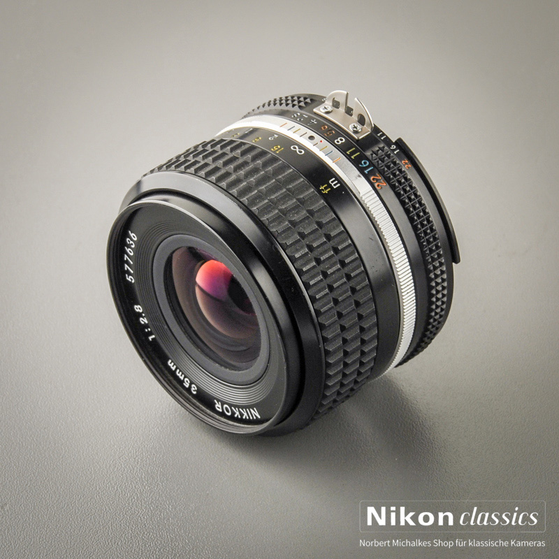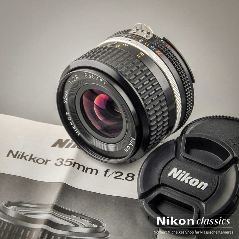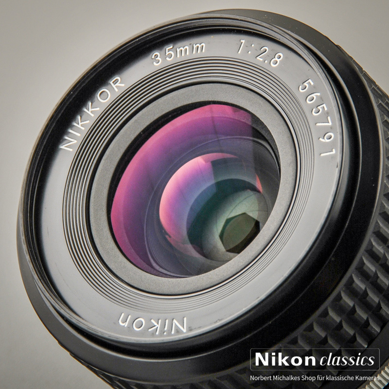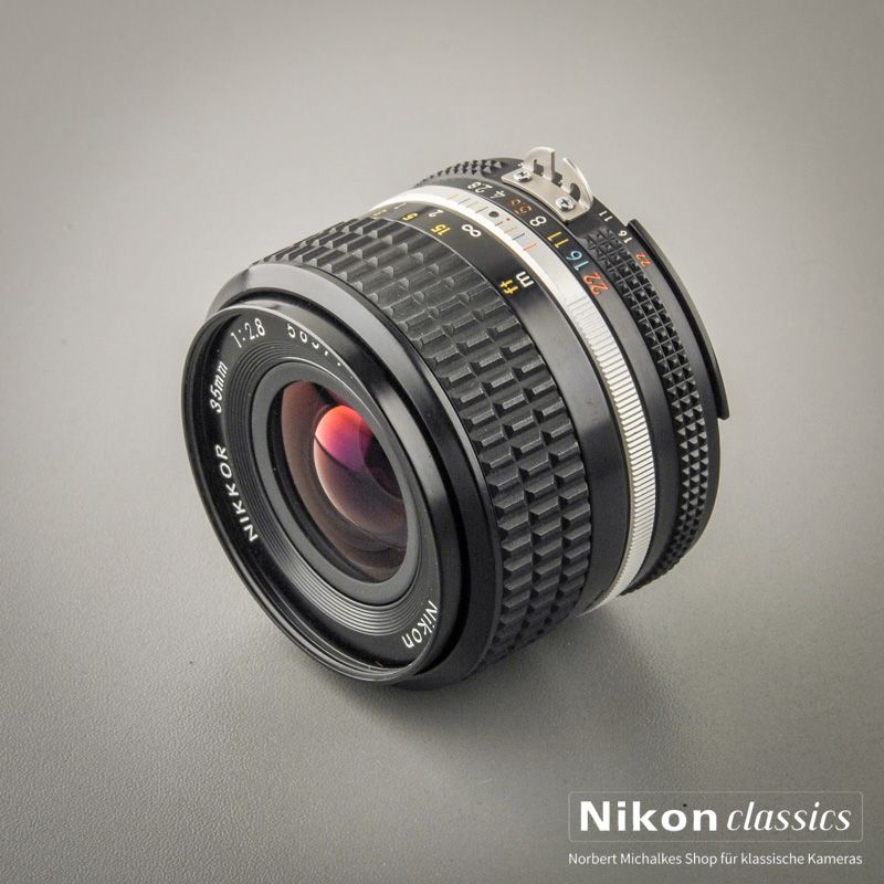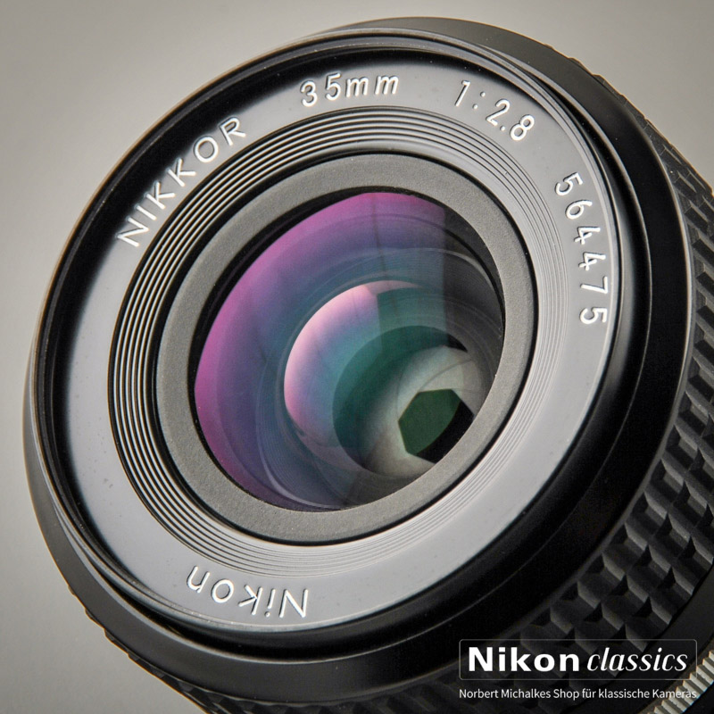 Das klassische leichte Weitwinkelobjektiv 35mm/1:2,8 für Puristen. 5-Linsiges Original Nikkor in Vollmetall-Ausführung! Hervorragende Korrektion der sphärischen Bildfehler und der Koma sichert aussergewöhliche Schärfeleistung und hohen Kontrast bereits bei voller Öffnung. Auf Grund seiner geringen Linsenzahl eignet sich dieses Objektiv hervorragend für Gegenlichtaufnahmen mit hohen Kontrasten.