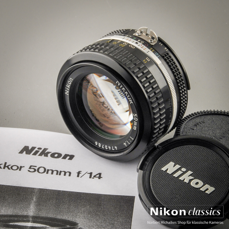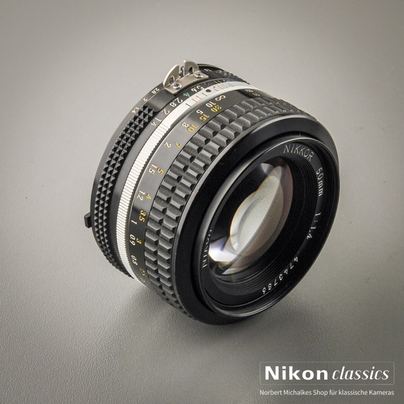 Das klassische manuelle hochlichtstarke Normalobjektiv 50mm/1:1,4. Gauss-Typ mit 7 Linsen in 6 Gruppen, naheinstellbar bis 0,45 Meter. Solide Vollmetallbauweise (ca 250 Gramm), wurde gebaut von 1977 bis 1981. Nikon Standard-Filtergewinde 52mm.
