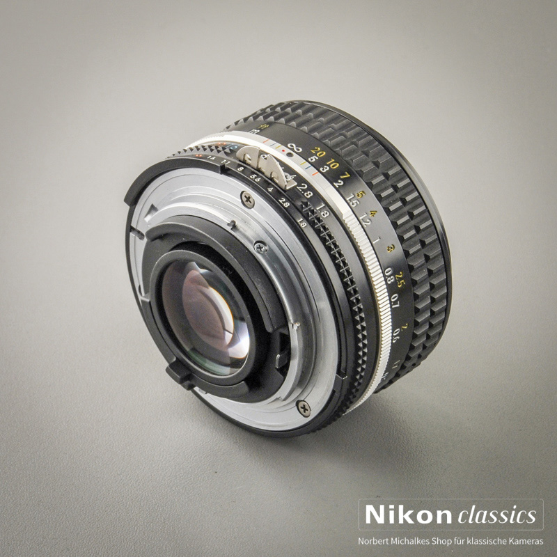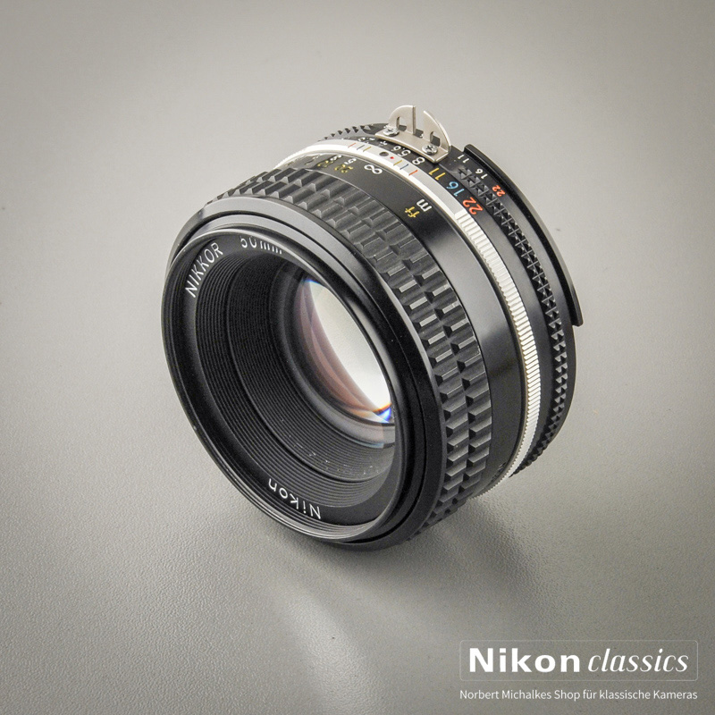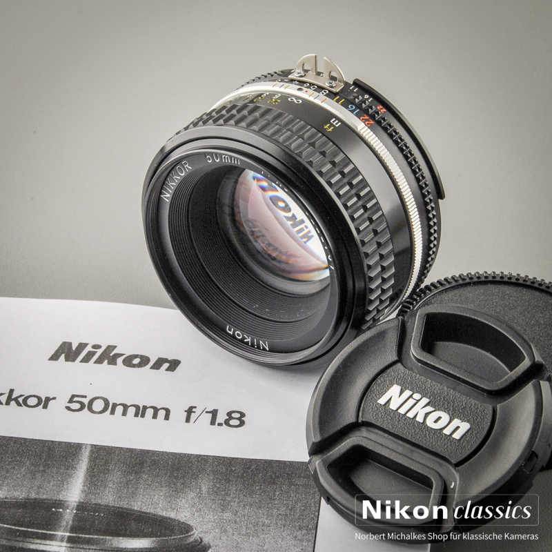 Das manuelle Normalobjektiv 50mm/1:1,8 AIS. Es handelt sich nicht um das einfachere und billigere Serie-E-Objektiv, sondern um das seltenere Original Nikkor in Vollmetall-"Steeped-Nose"-Ausführung!