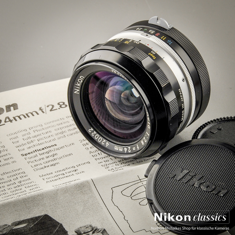 Das klassische lichtstarke Weitwinkelobjektiv 24mm/1:2,8 in der gefragten "Berg-und-Tal"-Ausführung. 9-Linser mit CRC-Technik für hohe Abbildungsleistung auch im Nahbereich. Neuere NC-Version mit Mehrschichtvergütung.