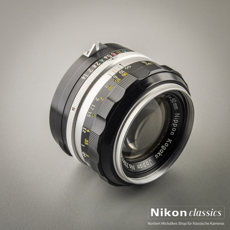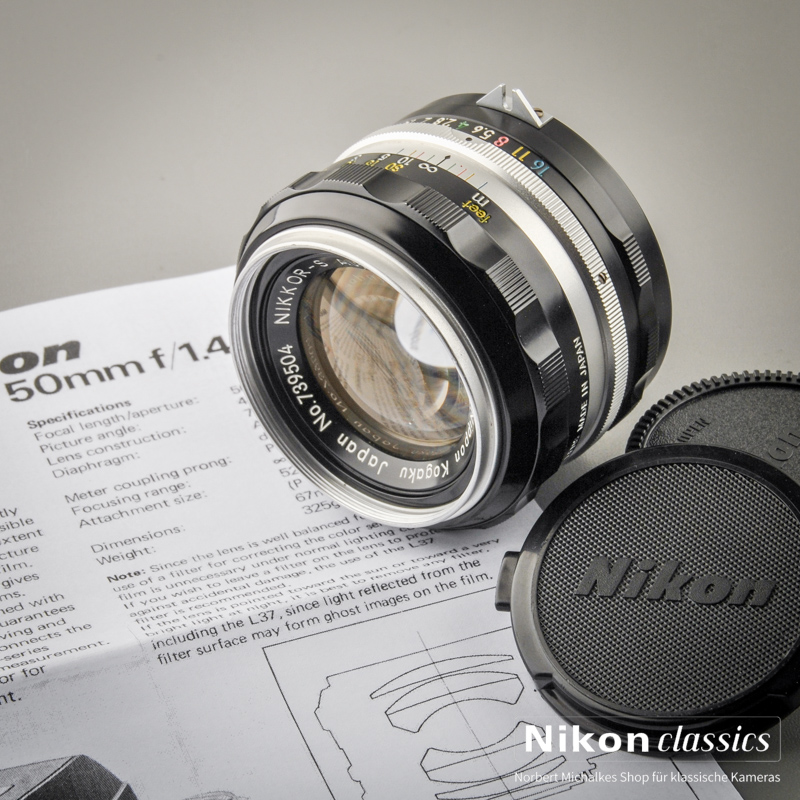 Das klassische hochlichtstarke Normalobjektiv 50mm/1:1,4 in der gefragten "Berg-und-Tal"-Ausführung. Frühe Version mit verchromten Filterring, Baujahr ca. 1969.