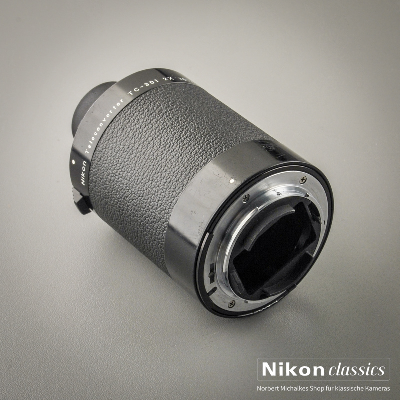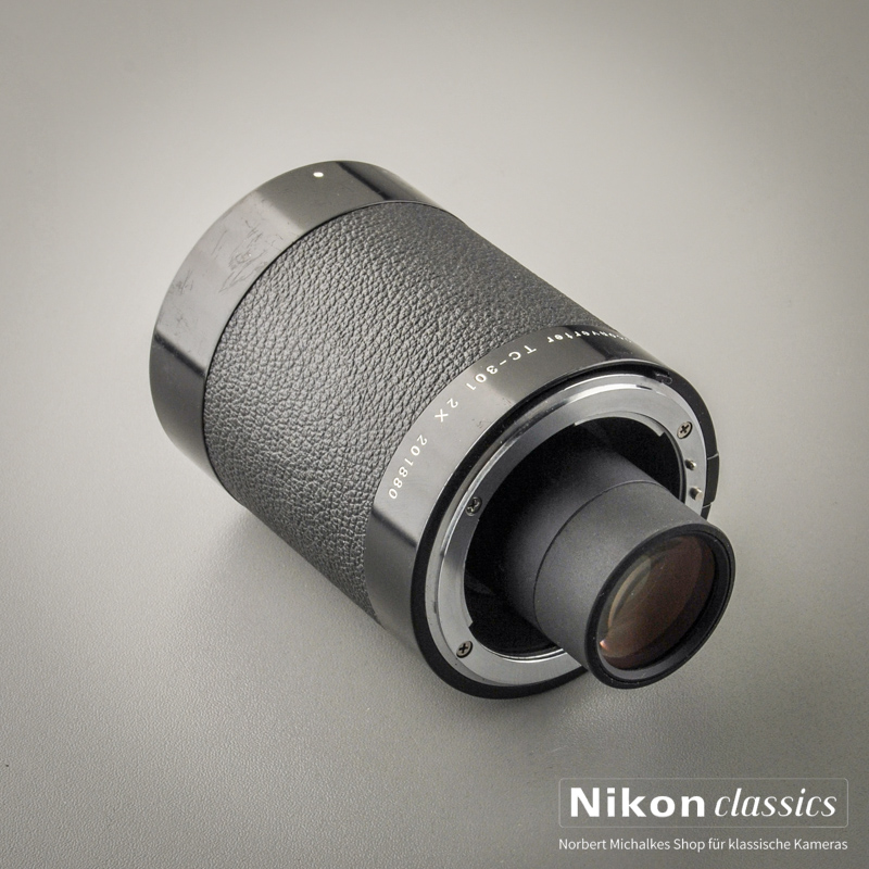 Der Nikon TC-301 verdoppelt die Brennweite des angesetzten Objektives. Verwendbar an Objektiven ab 300mm Brennweite. Mit AIS-Blendenkupplung und mechanischer Übertragung der Brennweiteninformation, aber ohne Autofokus. AF-Objektive (ausser G- und E-Typen) lassen sich aber mit manueller Scharfstellung verwenden. Hochwertige Optik mit sieben Linsen!