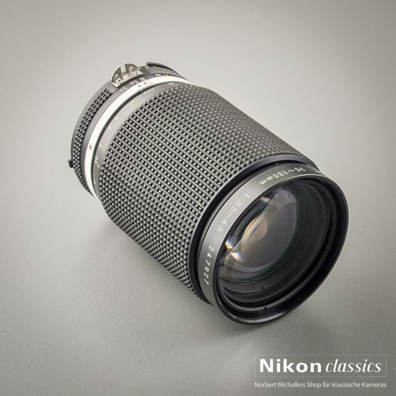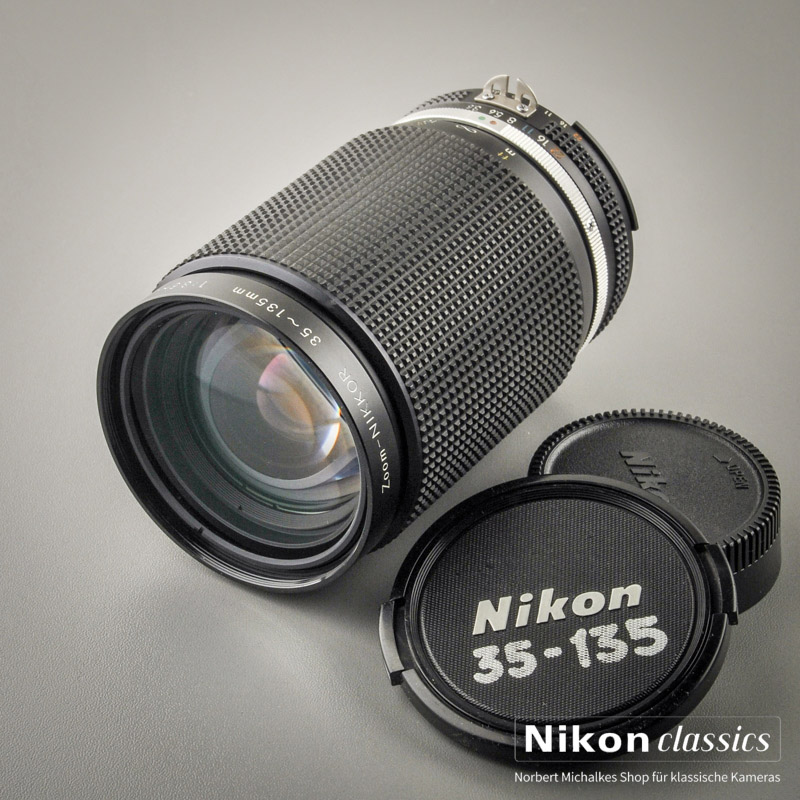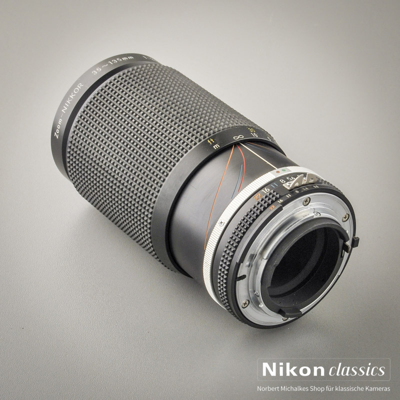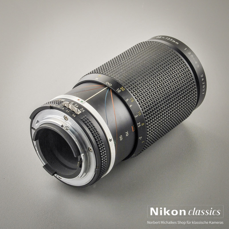 1984 kam diese Zoom mit etwas längerem Telebereich auf den Markt, mit 15 Linsen und 62 mm Filtergewinde. Es ist knapp zwei Zentimeter länger als ein festbrennweitiges 135er. Der Hauptunterschied zum 35-105/3,5-4,5 entpuppt sich in der Praxis als großer Vorteil: die Makroeinstellung von 1:3,8 wird beim 35-135-Zoom bei 135 mm Brennweite und einem Mindestabstand von 40 cm erreicht.