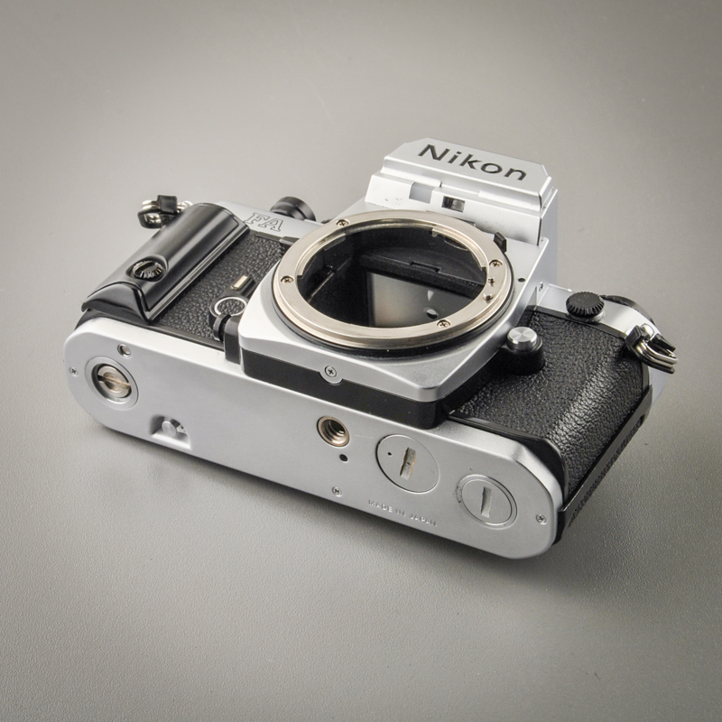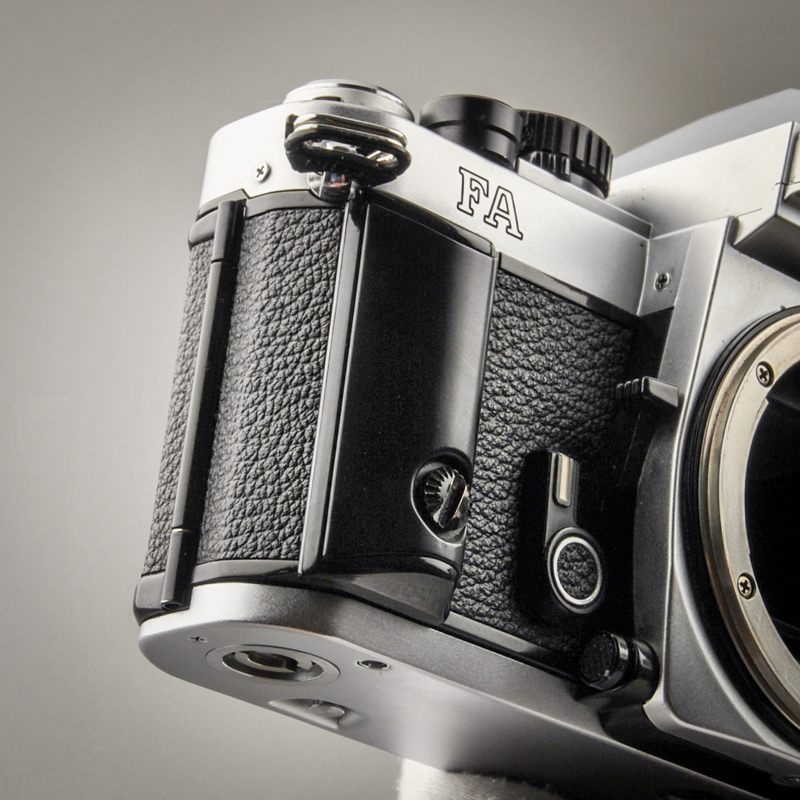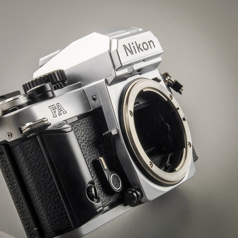 Mitte 1983 wurde die FM/FE-Reihe um ein neues Spitzenmodell erweitert, die Nikon FA. Sie bot als Neuerung eine Blenden- und sogar eine Programmautomatik. Diese ist unterteilt in einen normalen Programmverlauf und ein Kurzzeitprogramm, bei dem die Kamera die Verschlußzeit gegenüber der Blende um 1 1/2 Blendenstufen anhebt. Die Wahl des Programms erfolgt automatisch durch die jeweilige Objektivbrennweite. Selbstredend verfügt die Nikon FA auch über eine Zeitautomatik und den manuellen Abgleich von Zeit und Blende. Die obere Gehäusekappe aus Kunststoff ist im Gegensatz zu den Metallkappen der FM/FE2 über dem Prisma deutlich breiter ausgefallen, um die komplexe Elektronik für die AMP-Messung und die aufwendige Mechanik der Sucheranzeigen unterzubringen.