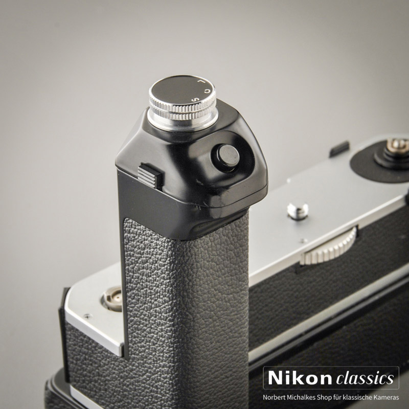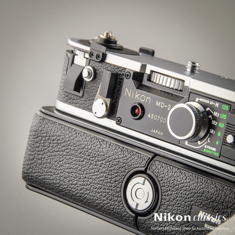 Schneller Motorantrieb für die F2-Reihe. Nachfolger des MD-1, Unterschied zwischen den beiden Ausführungen ist ein geänderter Auslöseknopf und ein Doppelkontakt an der hinteren rechten Ecke des Motors. Damit überträgt die als Zubehör lieferbare Stopprückwand MF-3 ein Signal an den Motor, denFilmanfang bei motorischer Rückspulung nicht in die Patrone hineinzuziehen.